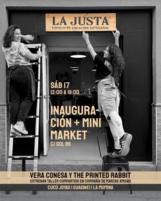 Hoy además estamos de celebración, dos de nosotras, María y Rocío, celebran que a partir de ahora compartirán espacio de trabajo La Justa, espacio de creación artesanal, en la calle Sol. Si nos estás leyendo hoy sábado, pásate a saludarnos, habrá un pequeño mercado con nuestras marcas y algunas marcas amigas, y podréis disfrutar además de ver a Zesar Bahamonte pintar un mural, un poco más adelante, como cierre de temporada del proyecto Ahe.